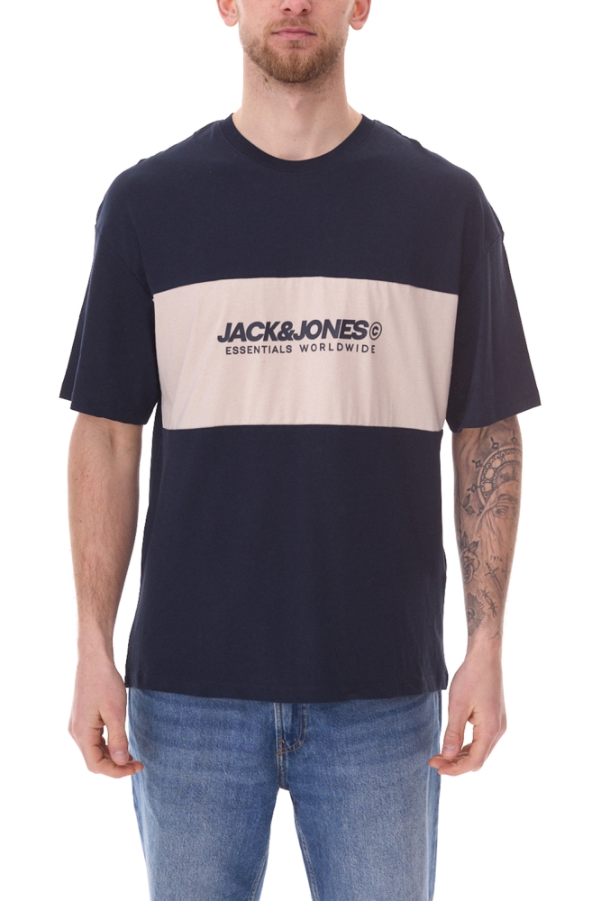 JACK & JONES Herren Rundhals-Shirt Baumwoll-Shirt T-Shirt Kurzarm Dunkelblau/Beige